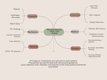 Thermal treatments such as laser ablation and EPSiT/RF ablation use controlled heat to destroy the sinus lining with fast recovery and minimal downtime. For more advanced cases, surgical treatments such as excision with primary closure, secondary healing or plastic reconstruction may be required.