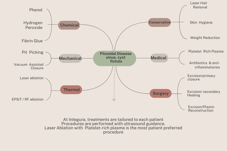 Pilonidal disease can appear as a sinus, cyst or fistula, and no single method works for every patient. This is why it is important to understand the full range of treatment options shown in the chart above. These treatments are grouped into Conservative, Medical, Chemical, Mechanical, Thermal and Surgical approaches to give a clear overview of how pilonidal disease can be managed.
